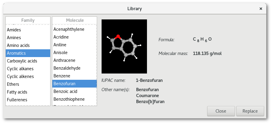 The atomes program includes a library with a number of molecules to be used when building or editing atomistic models:
