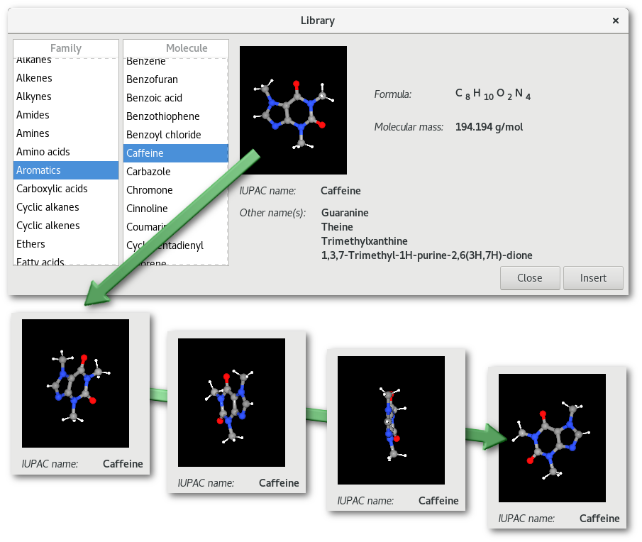 Each time a new molecule is selected in the tree view on the left side of the window (see figure 3.1), then the right side of the "Library" dialog is refreshed with the data of the newly selected molecule. The data includes a 3D representation included in an active OpenGL window that allows to rotate the molecule: