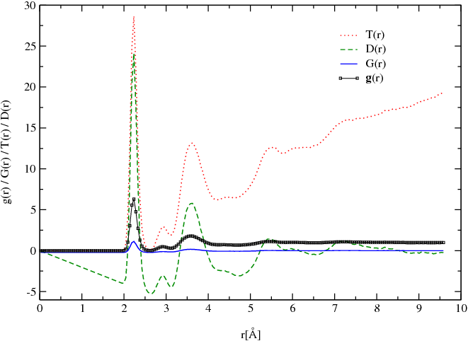 Figure 5.4 presents a comparison between the calculations of the total neutron structure factor done using the Debye relation [Eq. [s2q_2]] and the pair correlation functions [Eq. [s2q_7]]. The material studied is a sample of glassy GeS\(_2\) at 300 K obtained using ab-initio molecular dynamics. In several cases the structure factor \(S(q)\) and the radial distribution function \({\bf{g}}(r)\) [Eq. [s2q_8]] can be compared to experimental data. To simplify the comparison atomes computes several radial distribution functions used in practice such as \(G(r)\) defined [Eq. [s2q_5]], the differential correlation function \(D(r)\), \({\bf{G}}(r)\), and the total correlation function \(T(r)\) defined by: \[\begin{aligned} \label{s2q_9} D(r)\ =\ 4\pi r \rho\ G(r) \\ \nonumber {\bf{G}}(r)\ =\ \frac{D(r)}{\langle b^{2} \rangle} \\ T(r)\ =\ D(r)\ +\ 4\pi r \rho\ \langle b^{2} \rangle \nonumber\end{aligned}\] \({\bf{g}}(r)\) equals zero for \(r=0\) and approaches 1 for \(r\to\infty\).