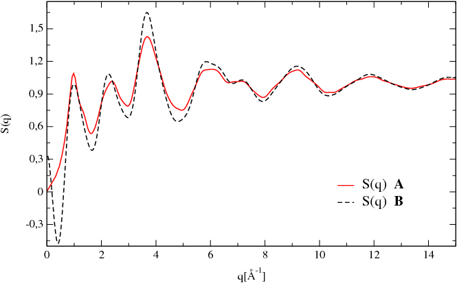 Neutron or X-ray scattering static structure factor \(S(q)\) is defined as: \[\label{s2q_1} S(q)=\frac{1}{N} \sum_{j,k} b_j\,b_k \left< e^{\displaystyle{iq[{\bf{r}}_j-{\bf{r}}_k]}} \right>\] where \(b_j\) and \({\bf{r}}_j\) represent respectively the neutron or X-ray scattering length, and the position of the atom \(j\). \(N\) is the total number of atoms in the system studied.