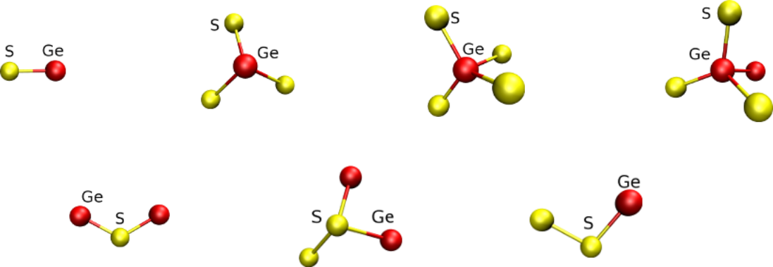 atomes computes the fraction of each type of coordination spheres in the model. The presence of of structural defects can lead to a wide number of local environments, figure 5.8 illustrates the different coordination spheres found in a GeS\(_2\) glass.