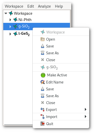 As illustrated in figure 3.3 the right click of the mouse display a menu basically reproduces the Workspace menu [Fig. 3.1-b], but also introduces two new buttons to activate the project (see section 3.5 for details) and edit its name.