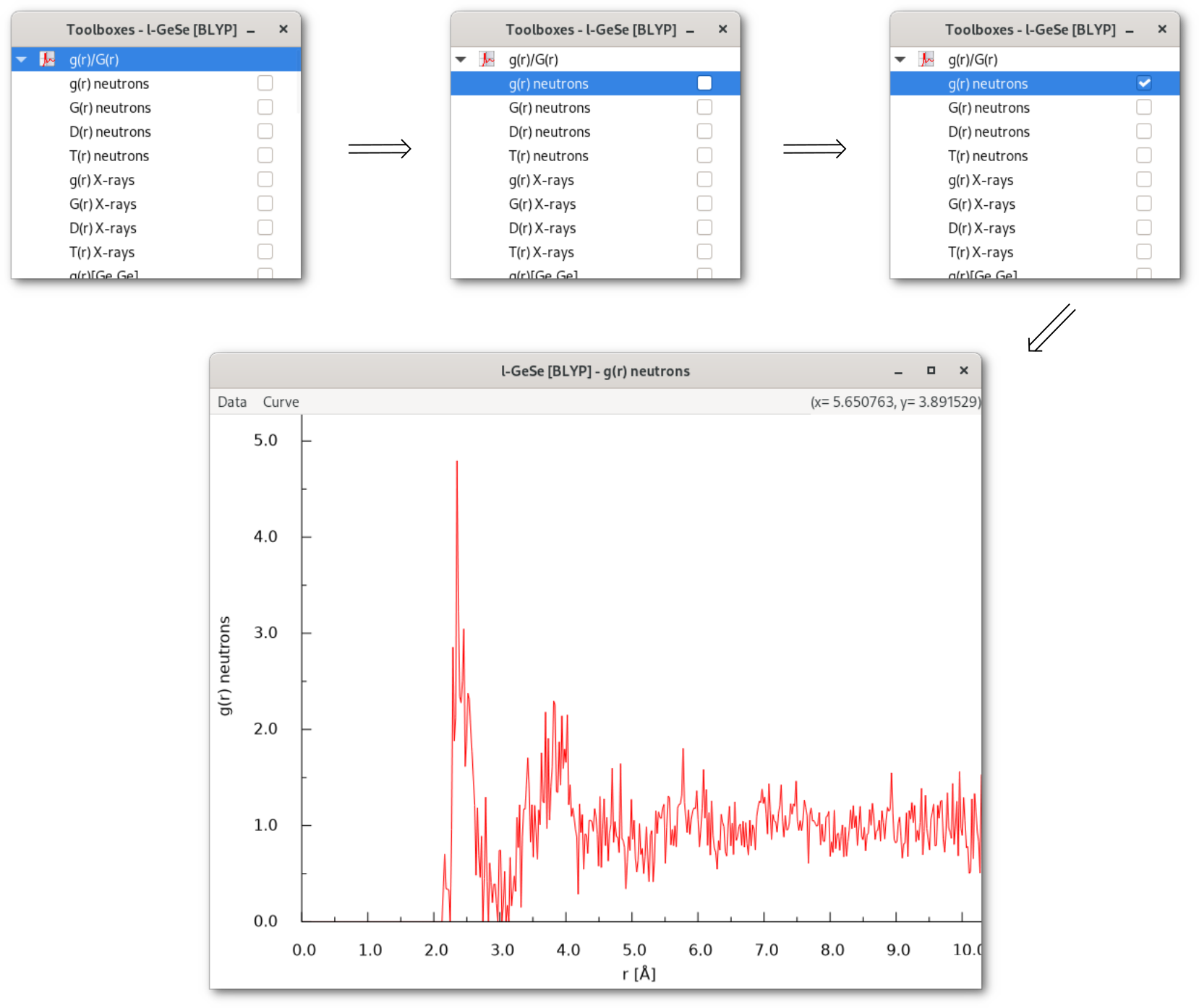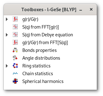 When a button in an interaction menu is activated [Fig. 4.3] the corresponding result is instantaneously displayed as a curve or a histogram [Fig. 4.3] depending on the nature of the computed structural characteristic, in figure 4.2 the g(r) for the project "l-GeSe [PW91]" for the example workspace in figure 4.1.