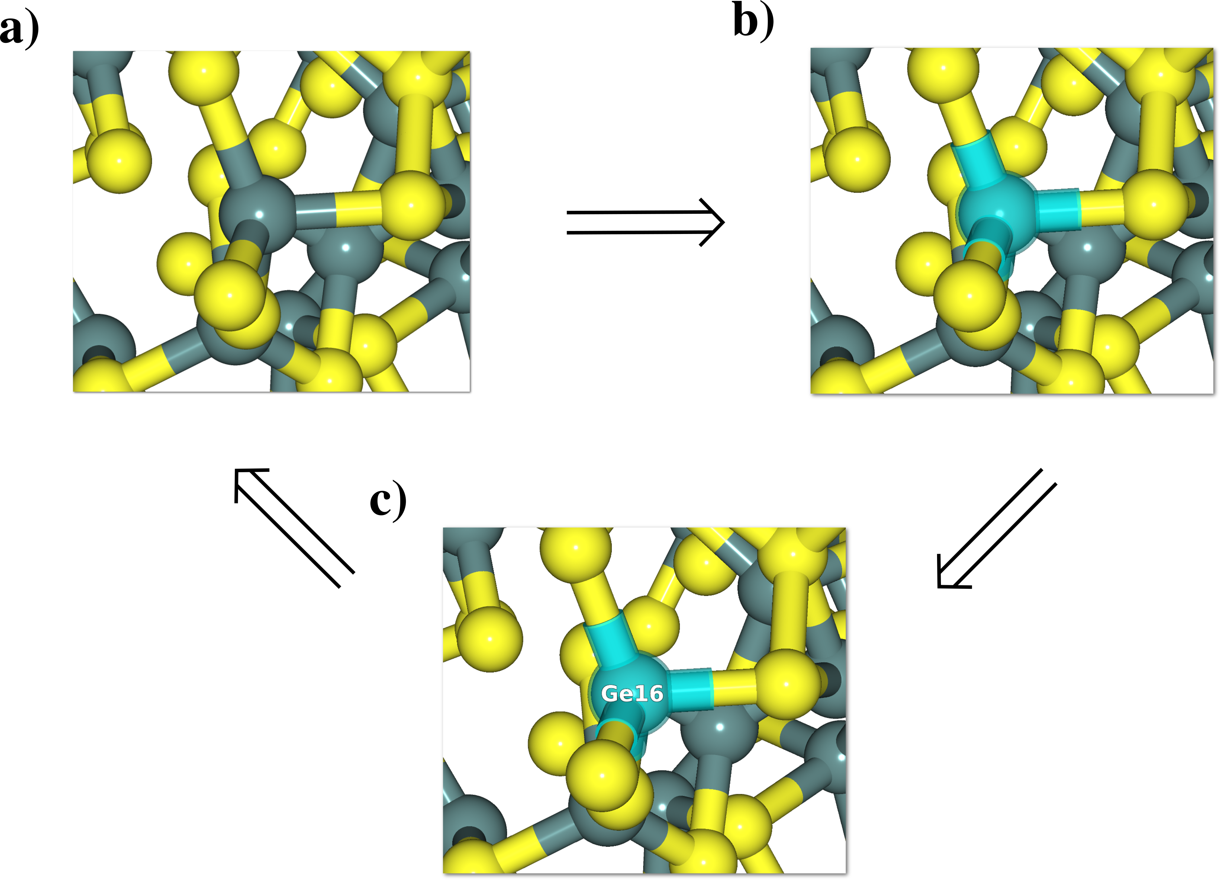 The first click on any atom/bond will select this atom/bond, the selection is highlighted / covered in light blue color [Fig. 5.20-b], a second click and the atom(s) label(s) will be added to the representation [Fig. 5.20-c], finally a third click will unselect the atom(s) and remove the label(s) [Fig. 5.20-a].