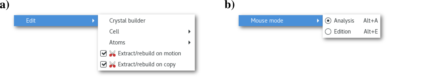 Edition tools are available via the "Tools" menu, and using either the "Edit" submenu [Fig. 6.1-a] or the mouse "Edition" from in the "Mouse mode" submenu [Fig. 6.1-b]: