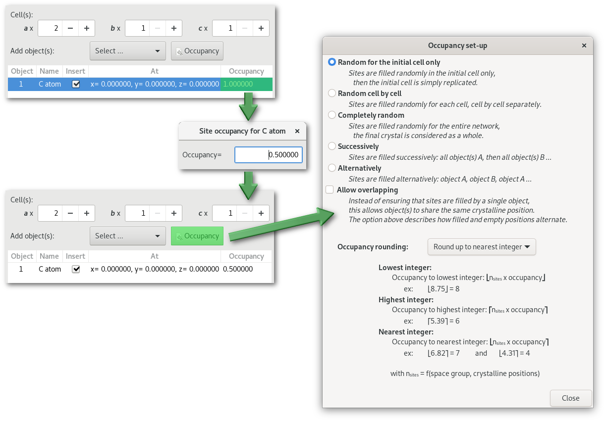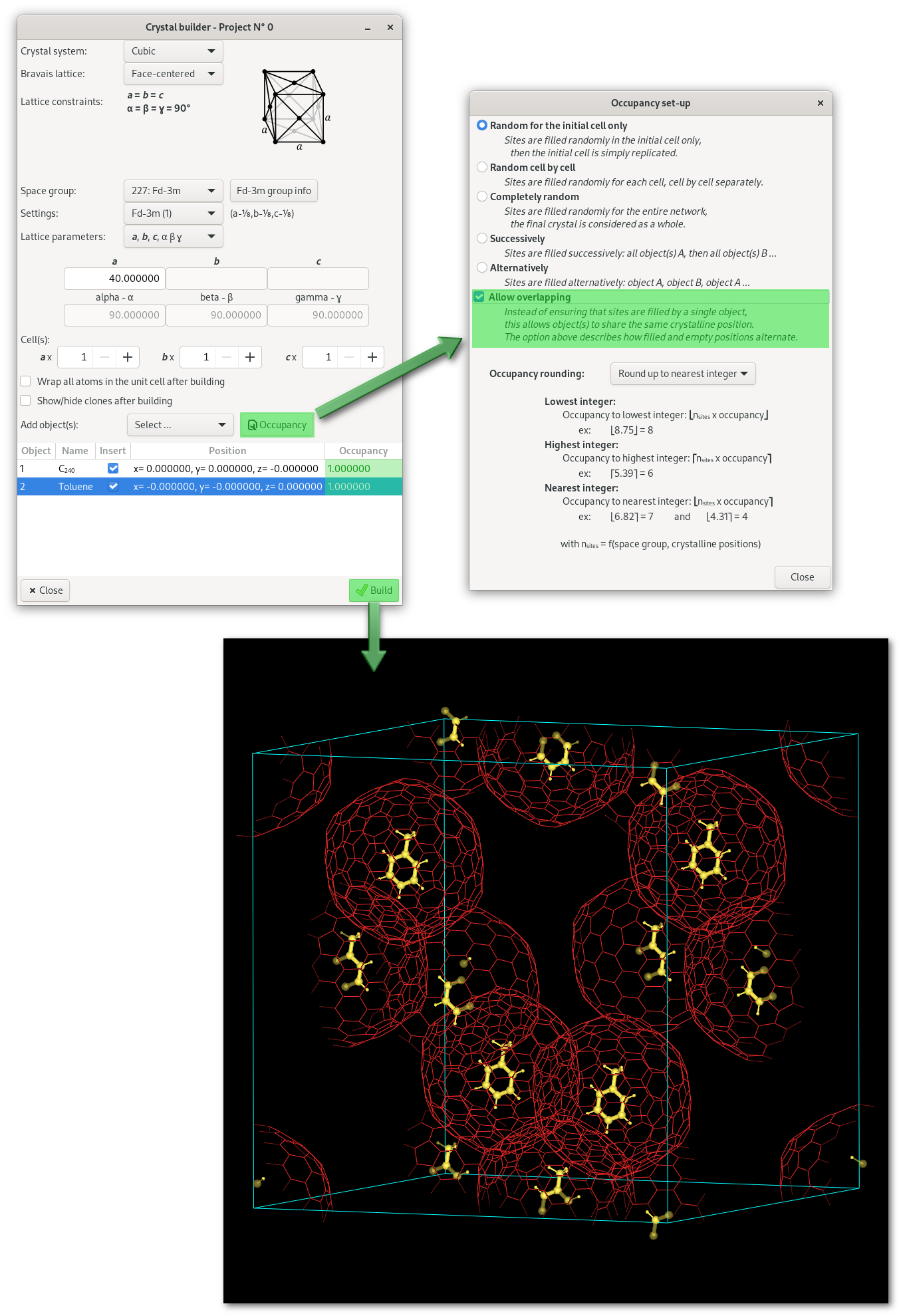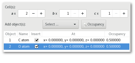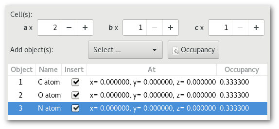Occupancy: as illustrated previously the order the object(s) is(are) inserted on the crystalline positions might have an importance on the final structure. This is true when the occupancy is < 1.0 and / or when object can share the same site when using the "