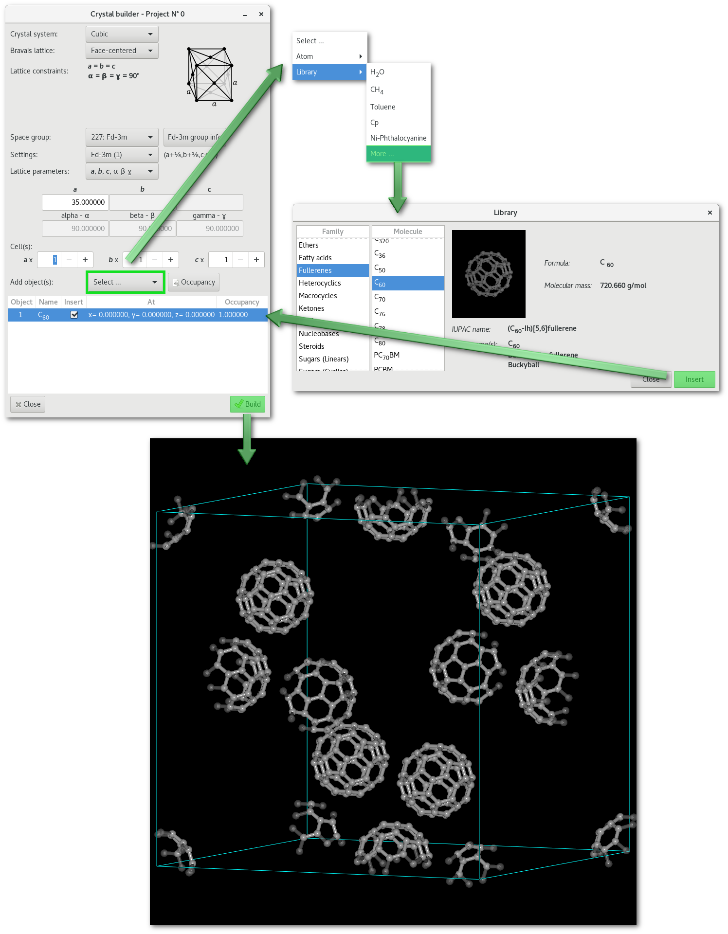 The "Crystal builder" window [Fig. 6.3] allows the creation of crystalline structure(s) and super-structure(s). Thus not only atom(s) but also molecules can be inserted to the crystalline positions defined by the space group.