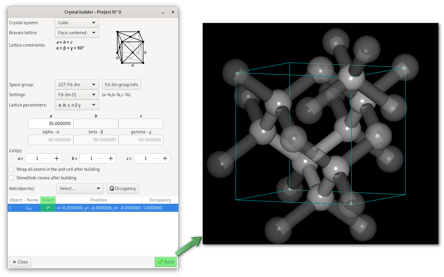 The following pages will present crystal building examples using the Fd\(\bar{3}\)m (origin 1 setting) space group (diamond-like structure):