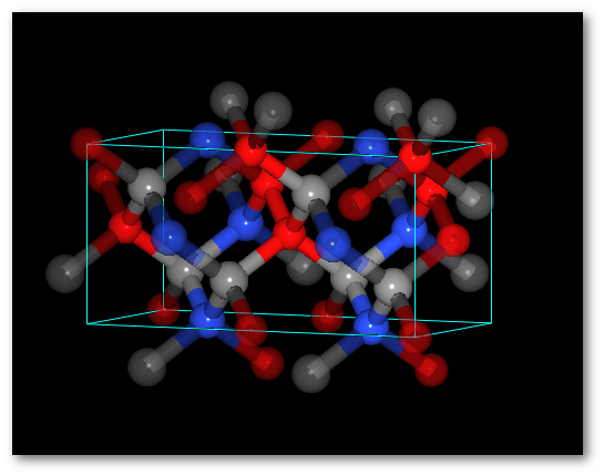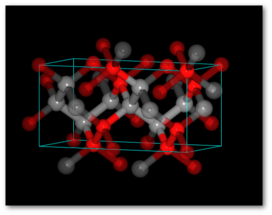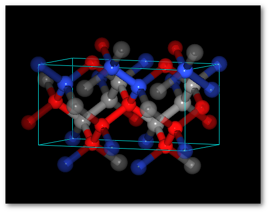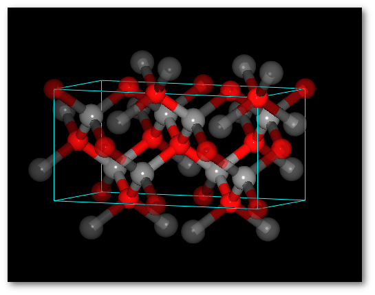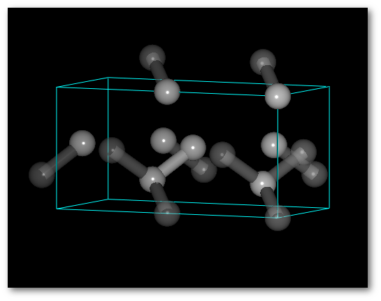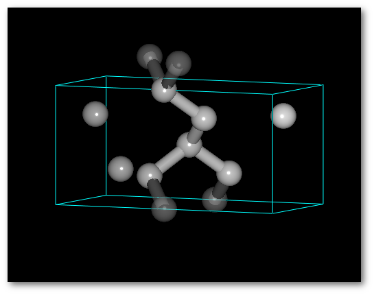 The crystal is then displayed (see figure 6.5-right), also clones (atoms linked using the PBC see section 5.1.2.3) are immediately shown. The existence of a chemical bond depending on the cutoff(s), determined automatically when creating the crystal, you might need to adjust the values to define properly the bonding of the system.