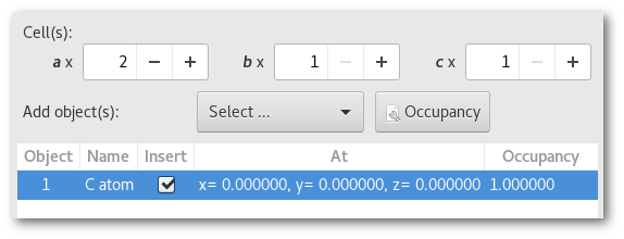 Insert a C atom at (0.0, 0.0, 0.0) with occupancy to 1.0, you can edit both coordinates and occupancy by double-clicking on the corresponding line.