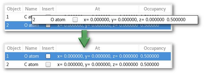 To ensure that the desired crystal will be built, either insert the object in the proper order or re-order them using the mouse drag an drop: