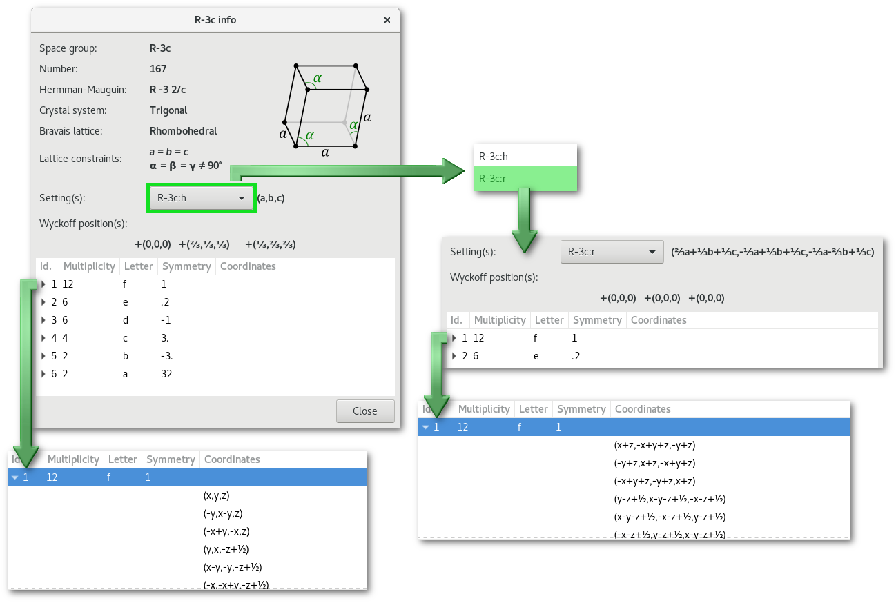 The main information available is presented in the "space group info" dialog [Fig. 6.4], including the different setting(s), and the corresponding initial coordinates and Wyckoff positions.