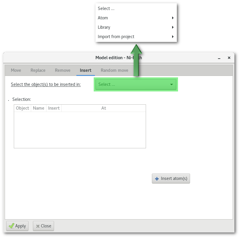 The "Select ..." menu reproduces the one from the "Replace" tab, see the bottom part in figure 6.17, and allows to insert atom(s) [Fig. 6.17-c], molecular fragment(s) [Fig. 6.17-d] and atom(s) from any other project opened in the workspace [Fig. 6.17-e]. Selecting any object to insert will populate and update the tree bellow, with a new line. Each line describes the object to be inserted, and offers options to confirm the insertion and specify the position where to insert the object in the model.
