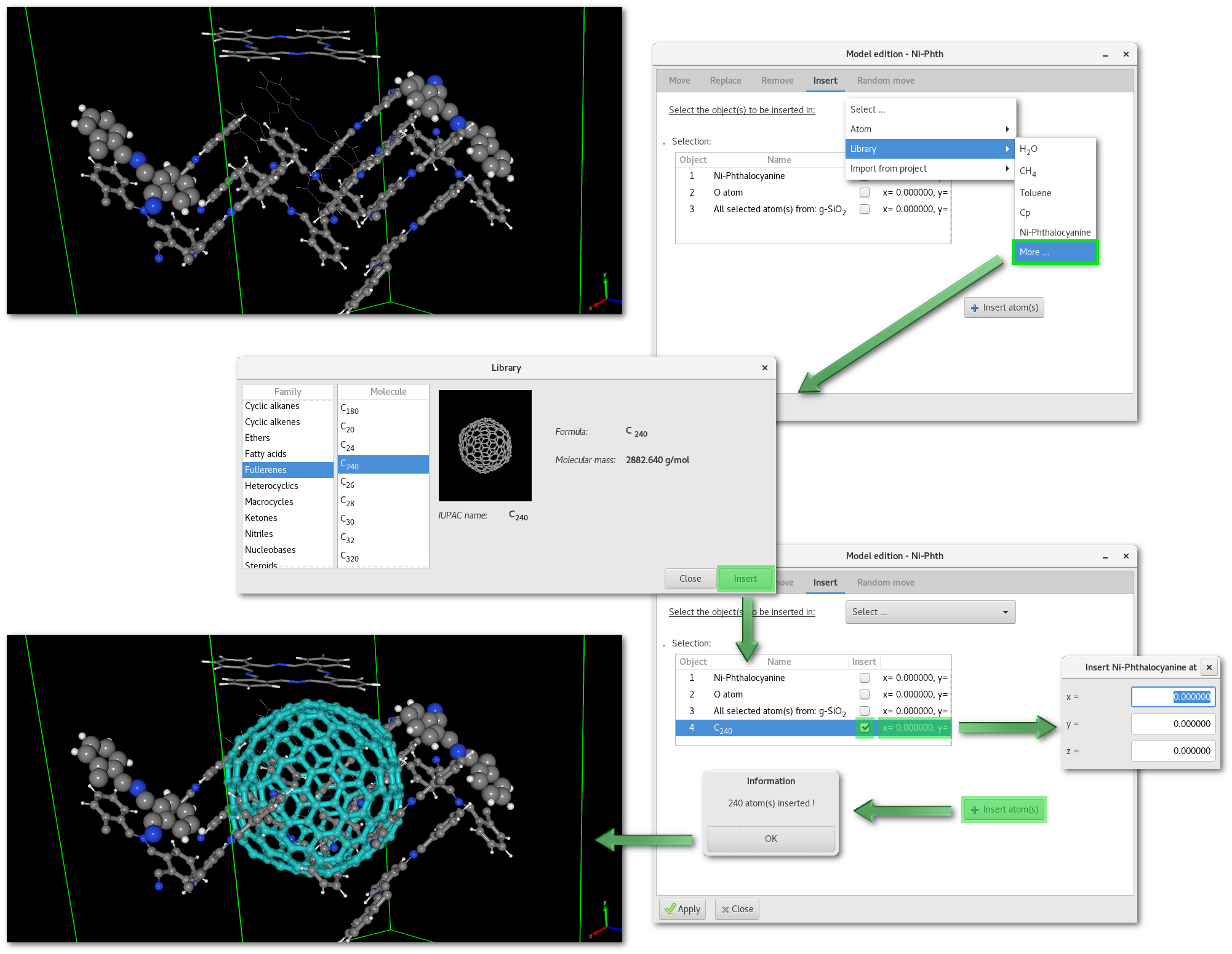 An example is provided in figure 6.21 where a fullerene "C240" is inserted in the "Ni-Phth" project modified after the removal example illustrated in figure 6.19.