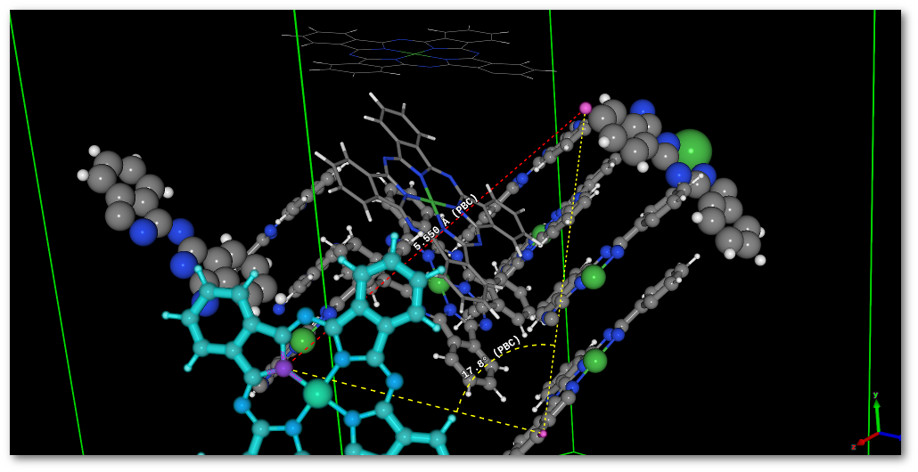 The "Move" tab allows to move atom(s) (translation only) or group of atoms (translation and rotation around the groups barycenter). In the following example one of the fragment in the model is selected, the fragment appears to be split because of the periodic boundary conditions: