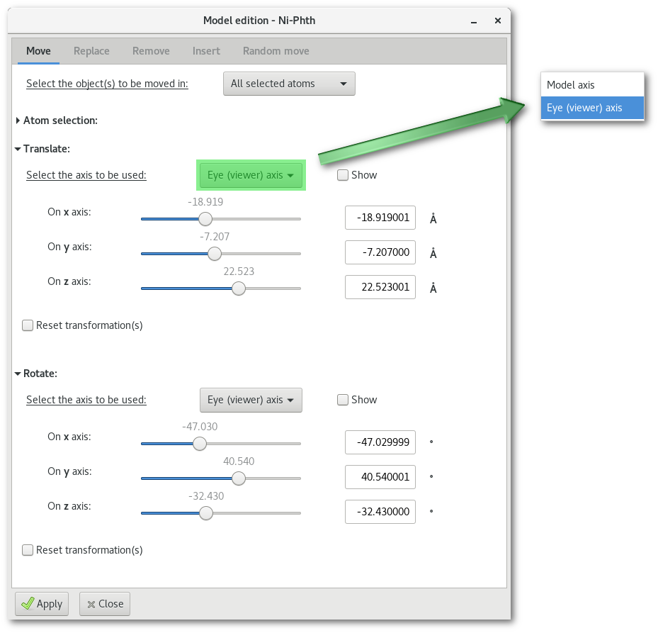 Eye (viewer) axis" and the "Model axis" (real x, y and z of the atoms).Motion actions: the motion interactors (ranges and input entries) allow to adjust motion very precisely, slightly more approximate motion is also available using the mouse (see Sec. 6.2)