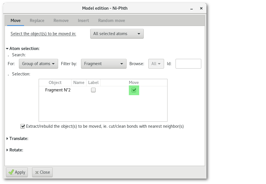 Atom(s)": if activated the object(s) to be moved will be extracted from the model and translated independently, otherwise chemical bond(s) will simply be stretched.For "