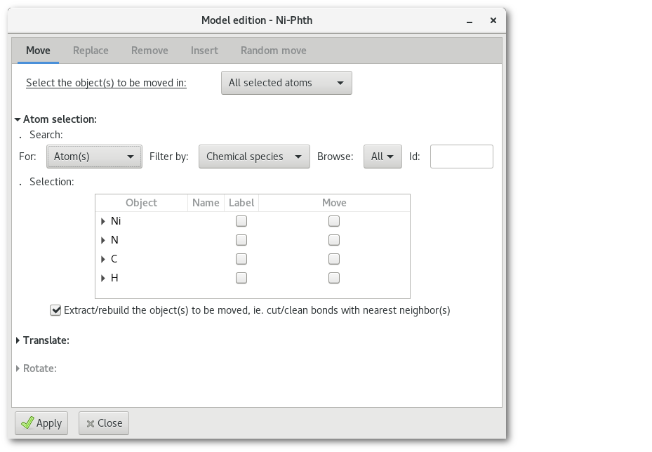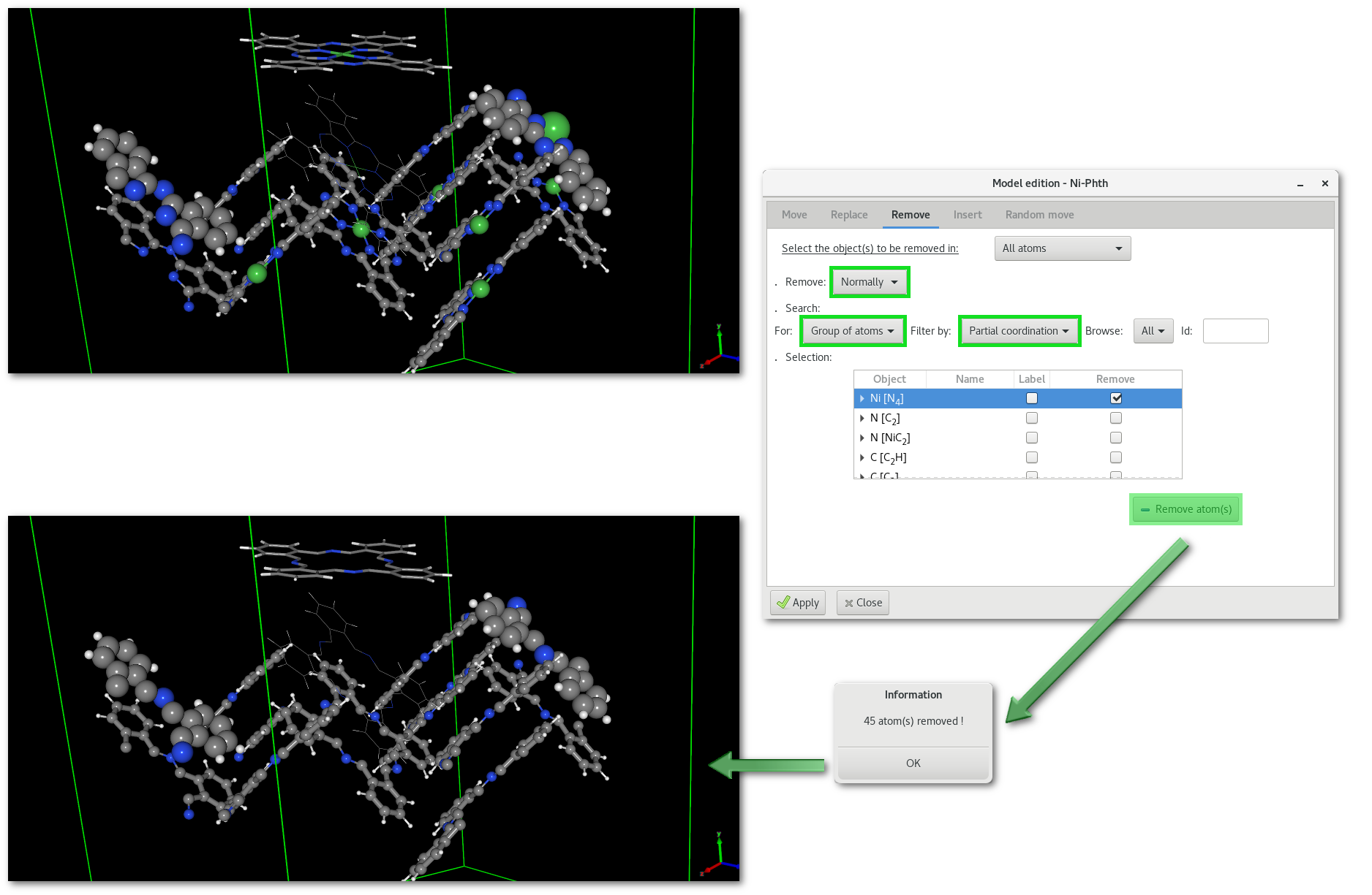 The "Remove" tab allows to remove object(s), atom(s) or group of atoms, like for the "Replace" tab the action can also be performed randomly. An example is provided in figure 6.19 with the normal (one by one) removal of all "Ni-[N4]" coordination spheres atoms from the "Ni-Phth" project: for a Nickel atom, this means that this "Ni" atom as well as it surrounding "N" neighbours are all removed.
