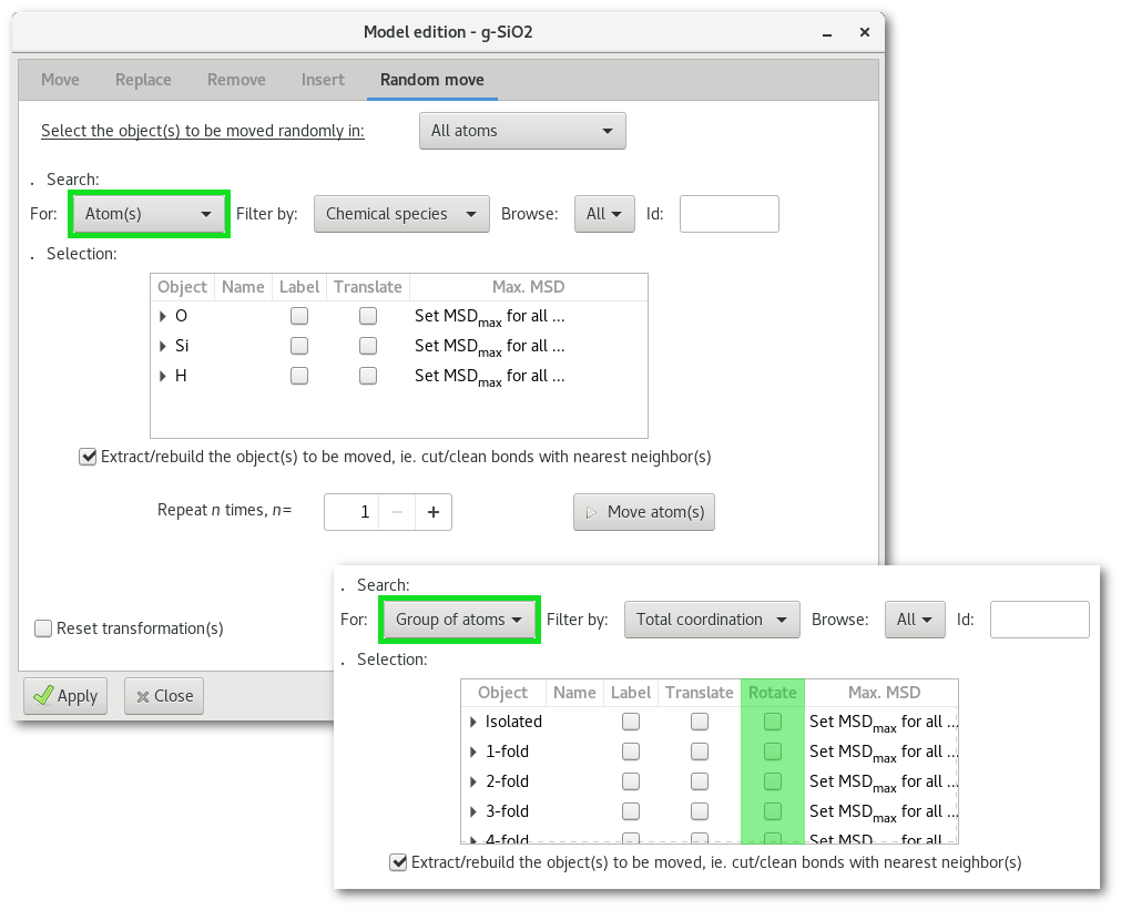 Rotate" column to select all object(s), actually all "water" molecules. It is required to enter a maximum MSD for each motion, click the top header of the "MAX. MSD" column to enter a suitable value. Optionally it is possible to iter the rotation process, at each step the rotation will be completely random.