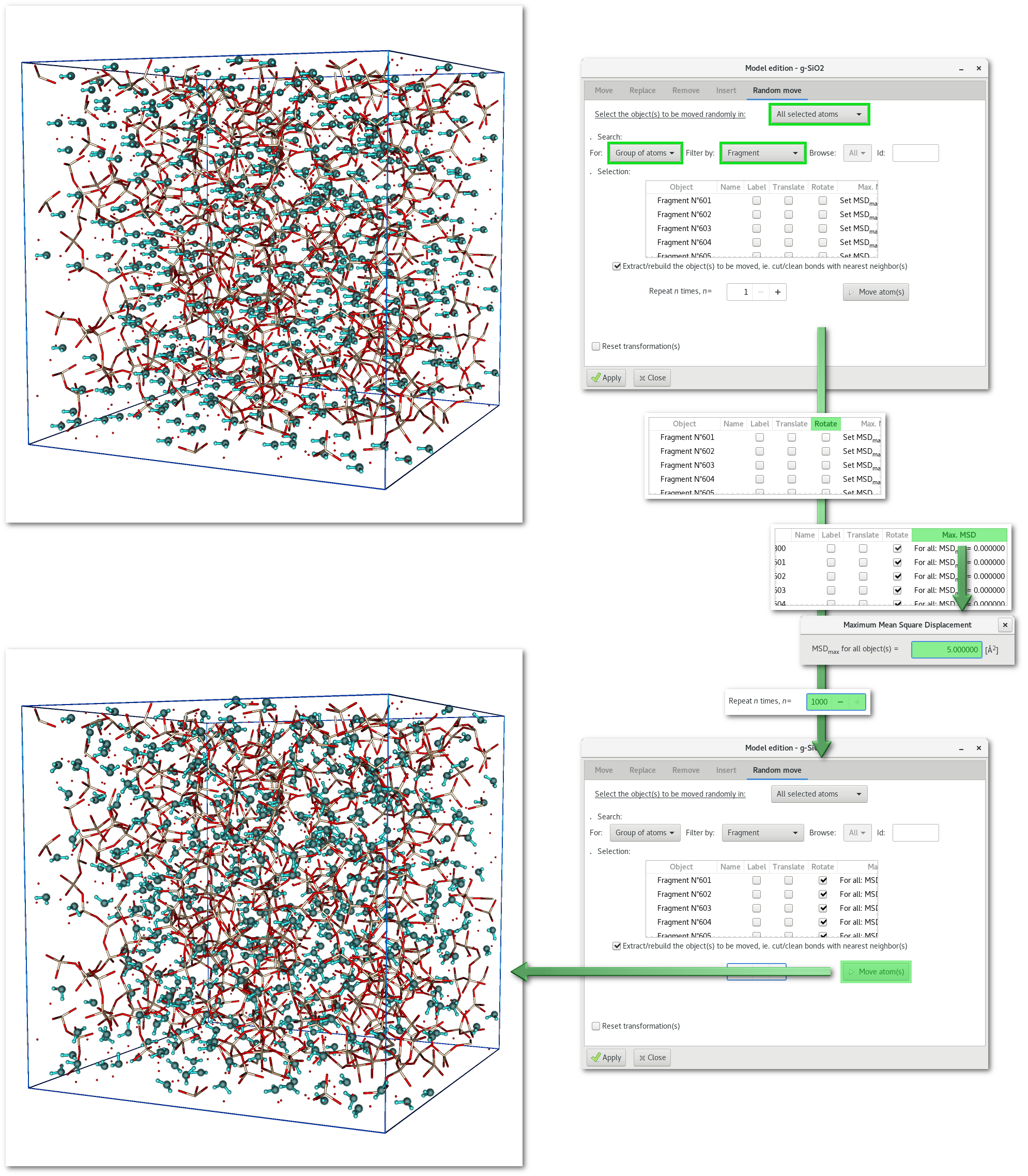 An example is provided in figure 6.23 with the random rotation of "water" molecules in the modified "SiO2" project after the substitution example illustrated in figure 6.18. Indeed after the substitution "water" molecules were all perfectly aligned, to correct this unlikely organization atomes can rotate randomly and independently every water molecule in the model: