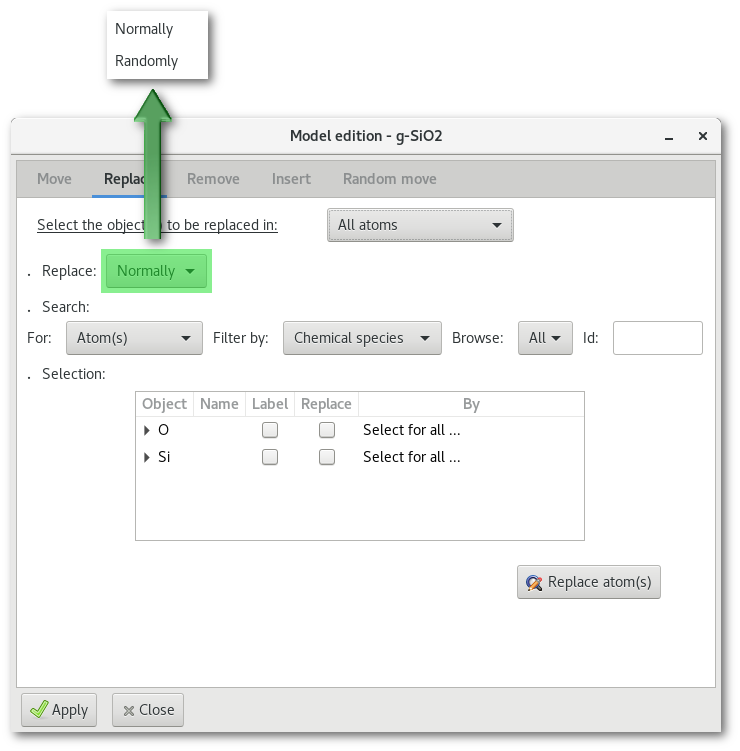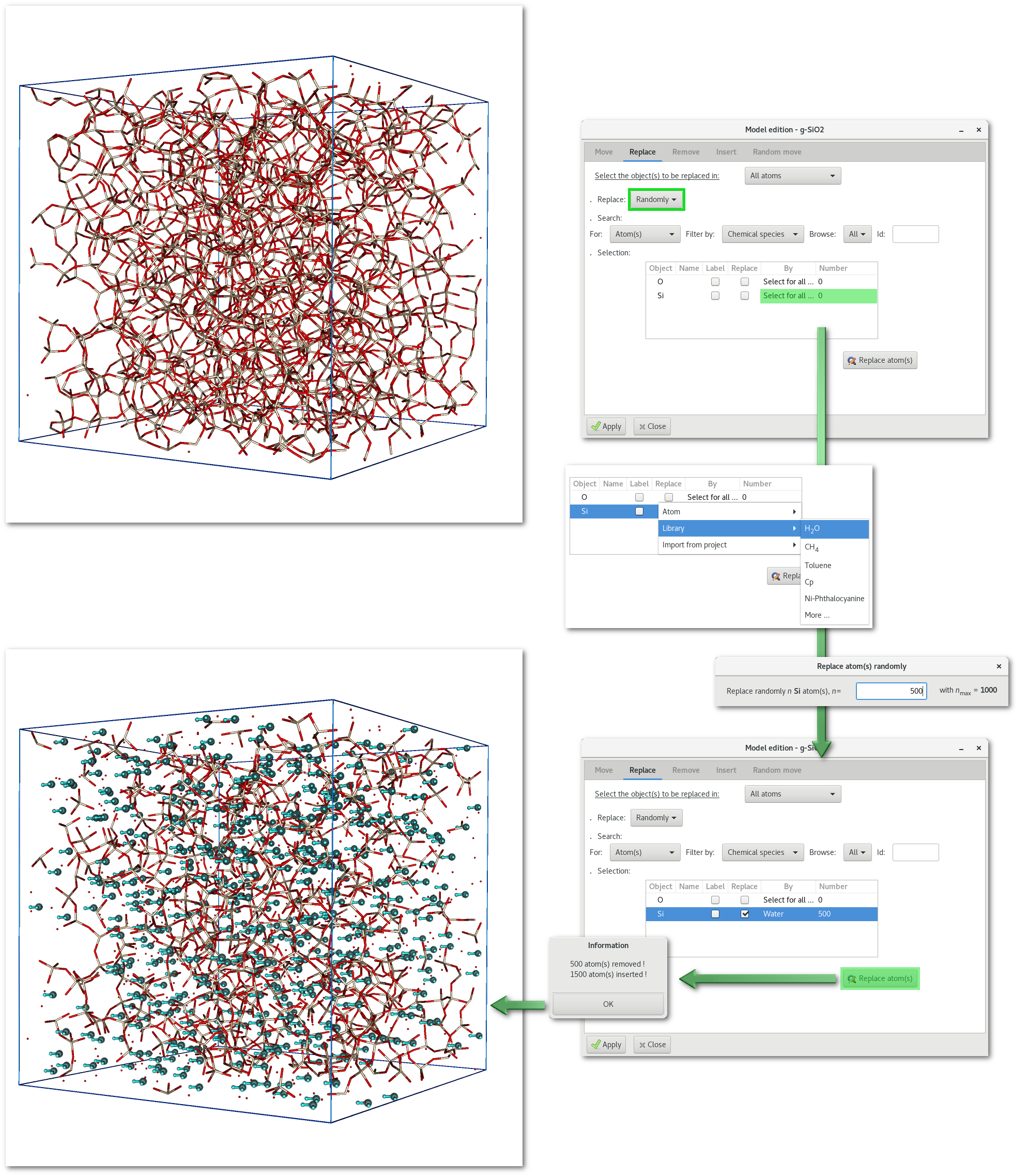 An example is provided in figure 6.18 with the random substitution of 500 "Si" atoms from the "SiO2" project by "water" molecules.