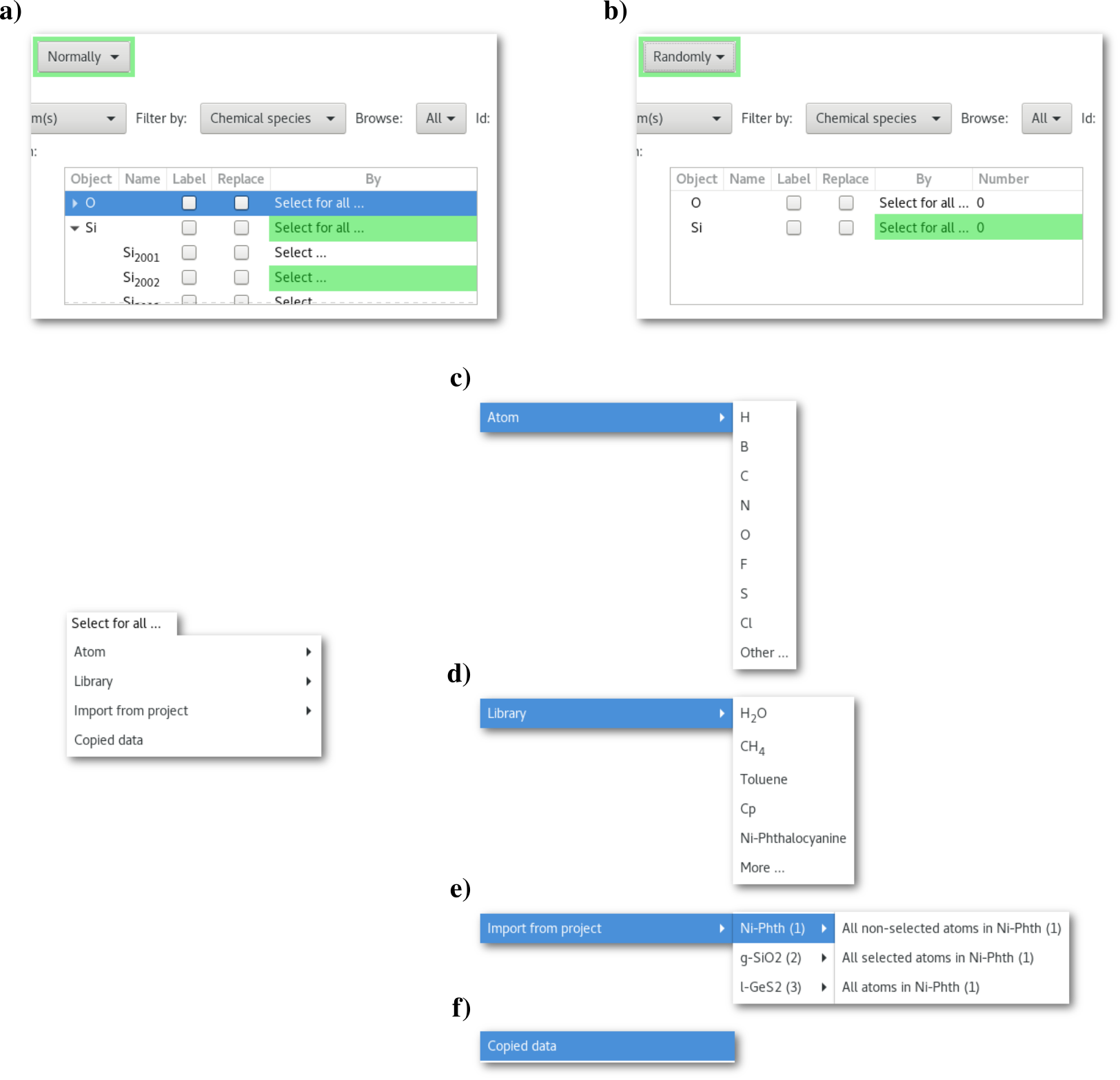 The substitution options accessible using the "Select ..." menu are illustrated in the bottom part in figure 6.17 with the different "atoms" c), "Library" d) and "Import from project" e) submenus.