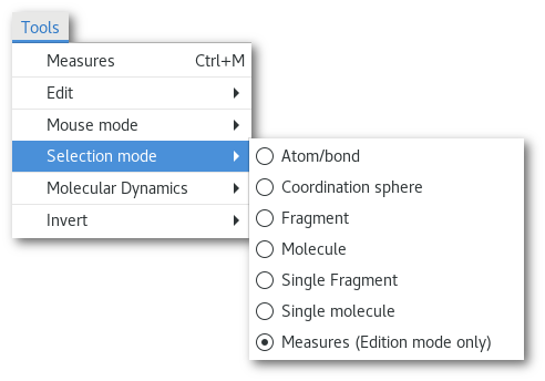 As for the "Analysis" mode object(s) can be selected using the mouse left click. In "Edition" mode selected atoms/objects are subjects to motion interactions using the mouse and it becomes complicated to check motion information with visual measurements. However using the "Tools" menu it is possible to activate the "Measures" selection mode (available when using the "Model edition" dialog (see section 6.1.2.7):